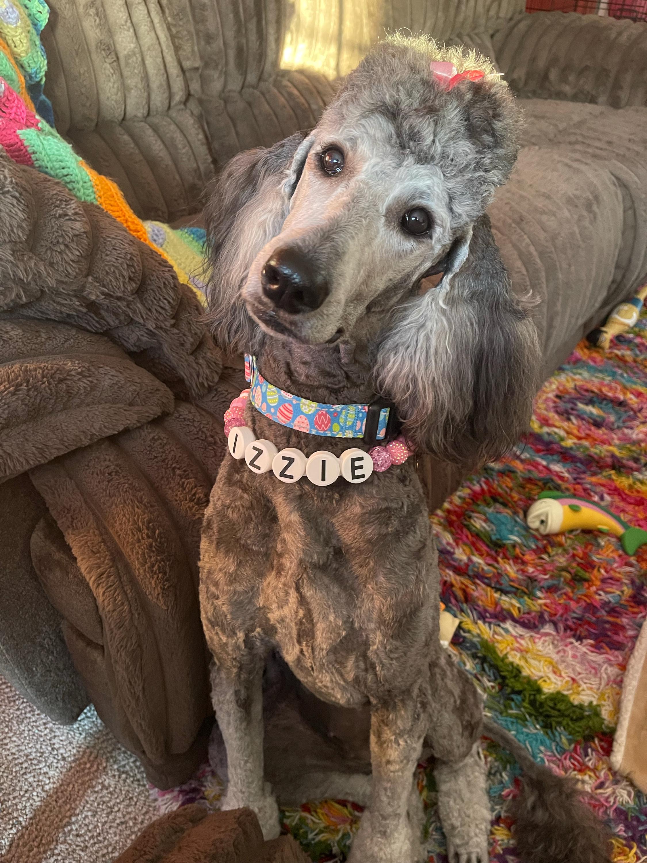 Vibrant Beads: Range from 20mm to 10mm in your selected color. If you have a 12” collar with a long name you’ll get small beads and small letters.