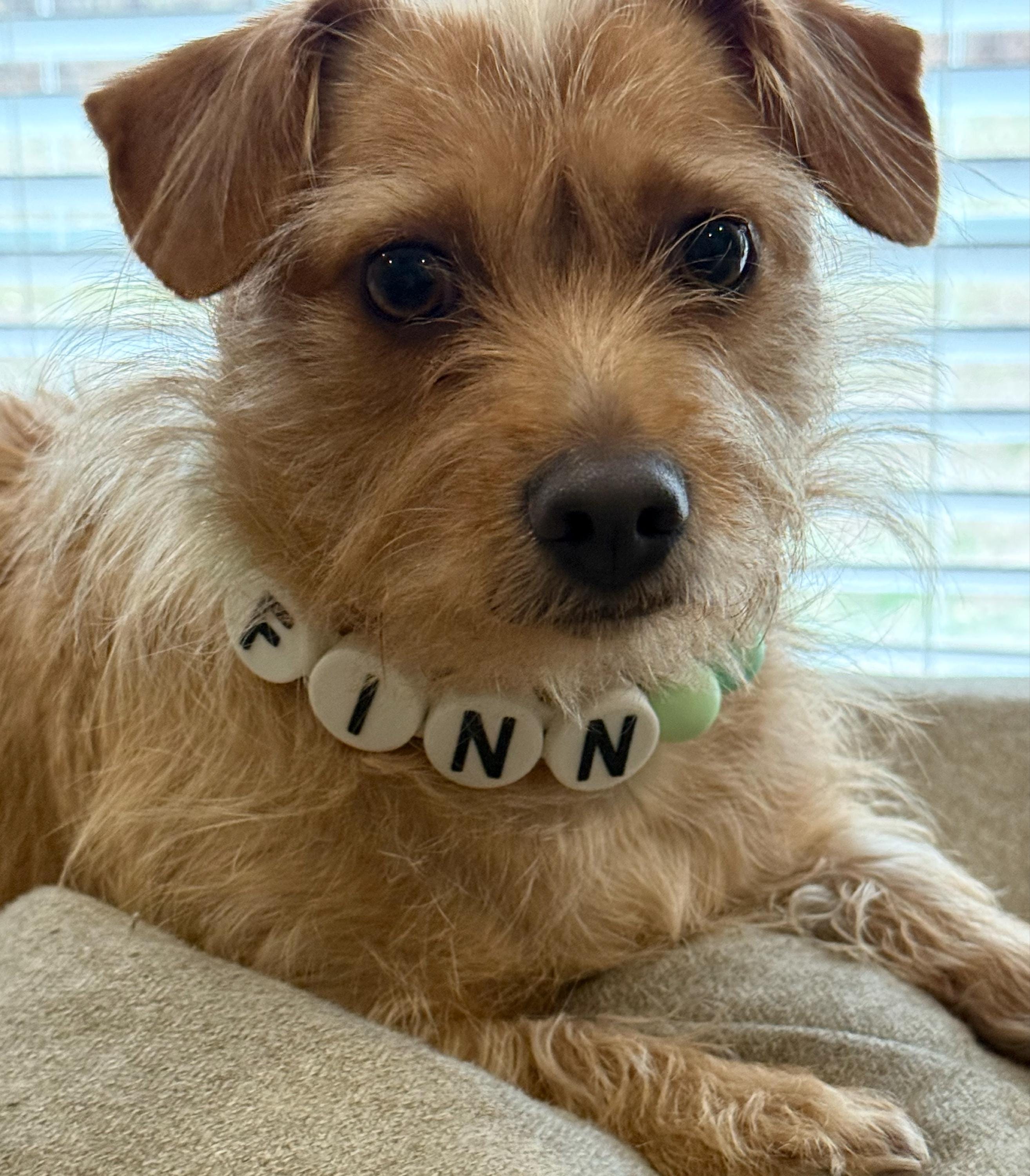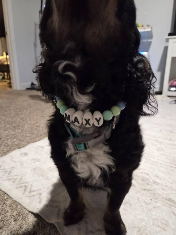 Each collar is designed for comfort and durability, expertly strung on plastic-coated stainless steel wire and connected to a heavy-duty nylon strap. The adjustable length allows for a perfect fit, making it suitable for dogs of all sizes. Personalize it with your dog's name for a touch of individuality.
