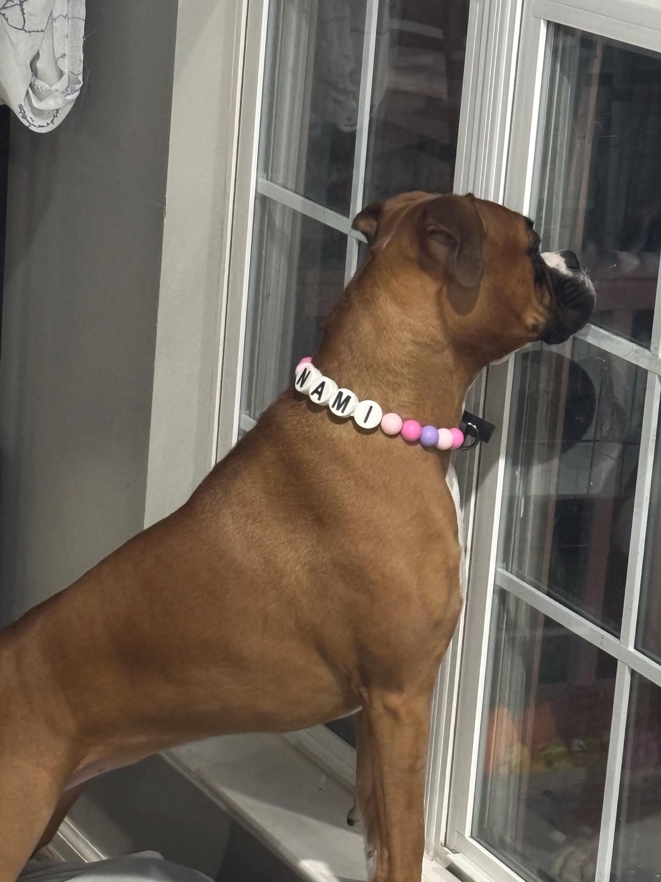 Each collar is designed for comfort and durability, expertly strung on plastic-coated stainless steel wire and connected to a heavy-duty nylon strap. The adjustable length allows for a perfect fit, making it suitable for dogs of all sizes. Personalize it with your dog's name for a touch of individuality.