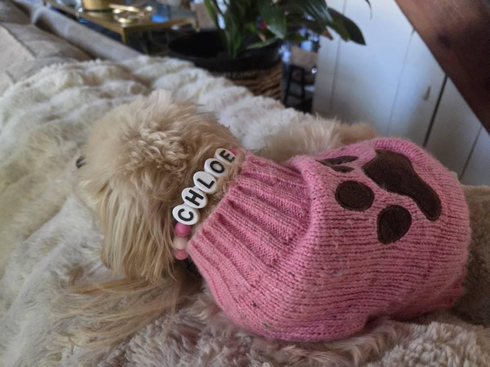 Vibrant Beads: Range from 20mm to 10mm in your selected color. If you have a 12” collar with a long name you’ll get small beads and small letters.