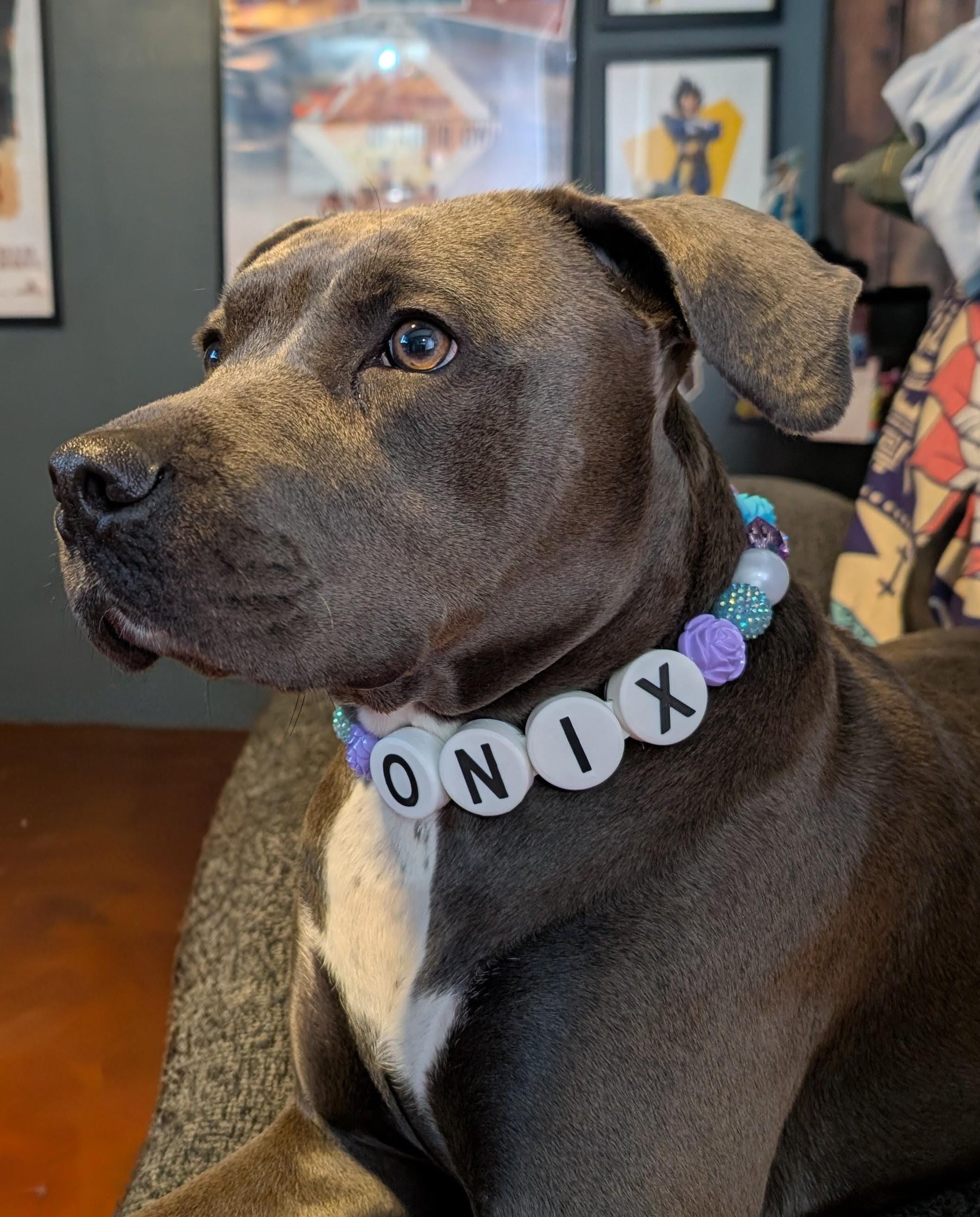 Featuring custom 3D-printed block letters spelling your dog’s name and vibrant beads in our limited edition Bridgerton dog collar. This collar blends style and durability. The beads are strung on vinyl coated stainless steel wire, and secured to the heavy duty nylon strap.
